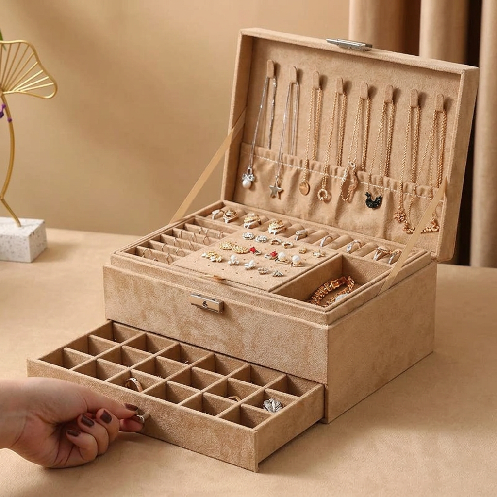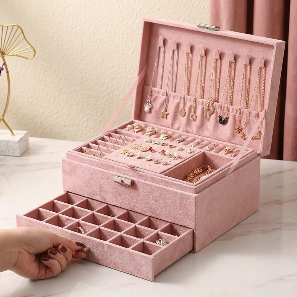 Nos boîtes à bijoux allient compartiments pensés, matériaux raffinés et design élégant pour sublimer votre quotidien.