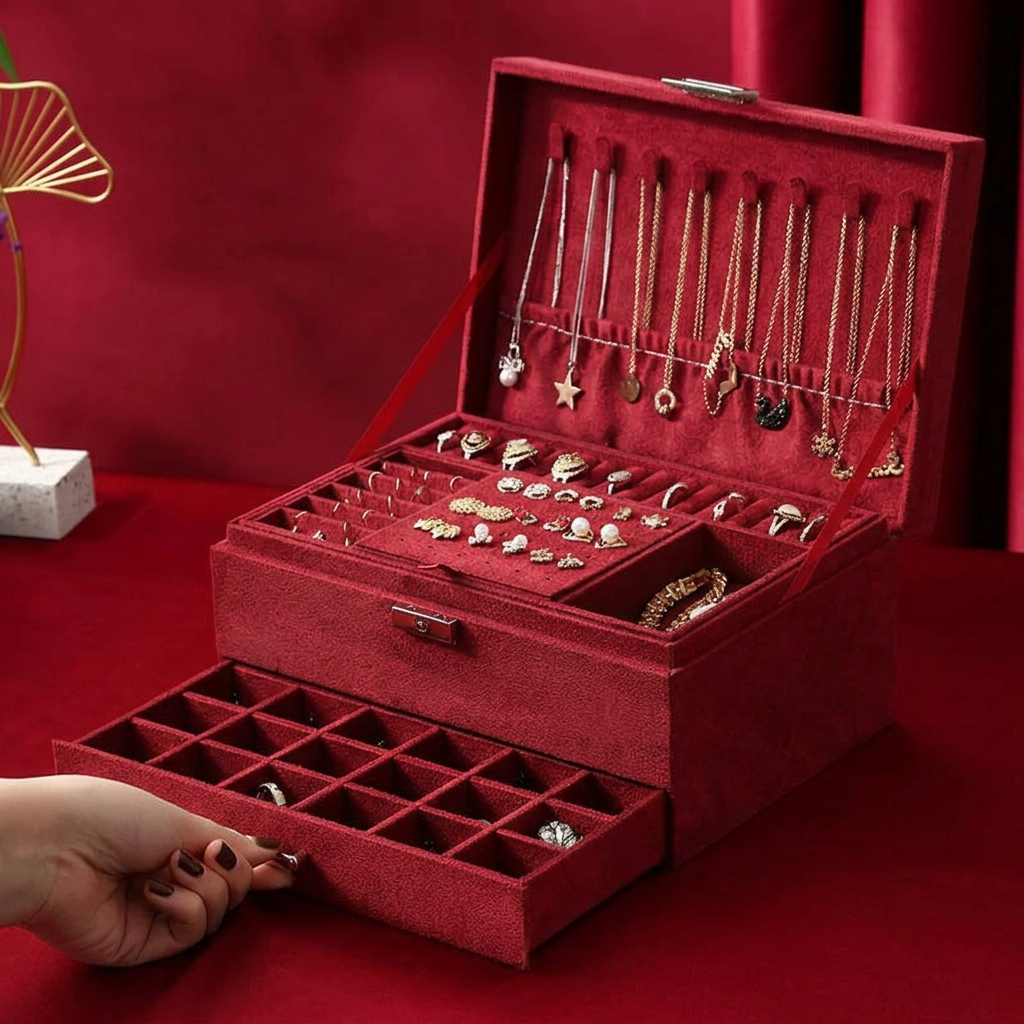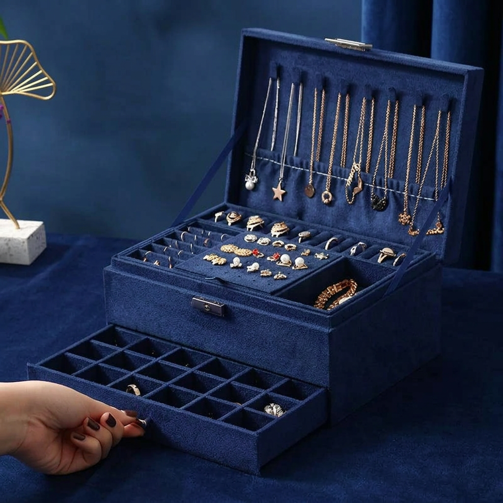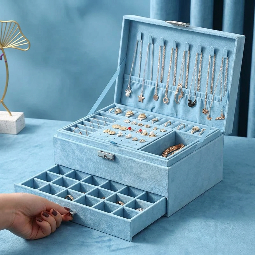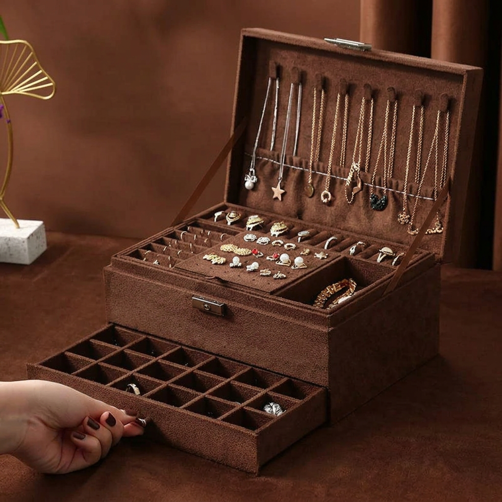 Cela dépend du modèle. Notre Boîte avec Tiroirs dispose de compartiments dédiés : fentes pour bagues, crochets pour colliers, panneaux pour boucles d'oreilles et espaces pour bracelets. Fini les colliers emmêlés et les boucles orphelines.
